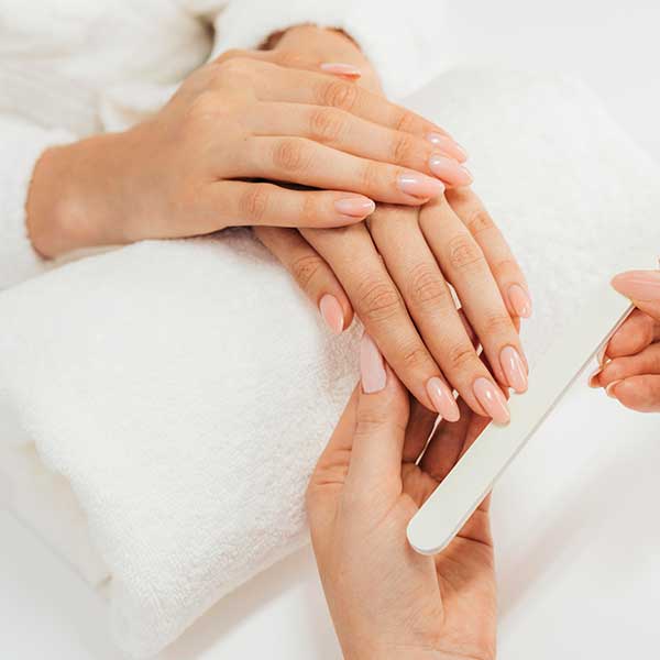 Nail Treatments. Have your hands soaked in lukewarm water then gently exfoliated with organic scrubs, cuticle groomed, nails neatly trimmed and filed in shape, and finished with the color and design of your choice.